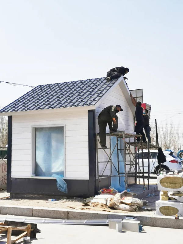 院里的小房子屋面正在安装琉璃瓦